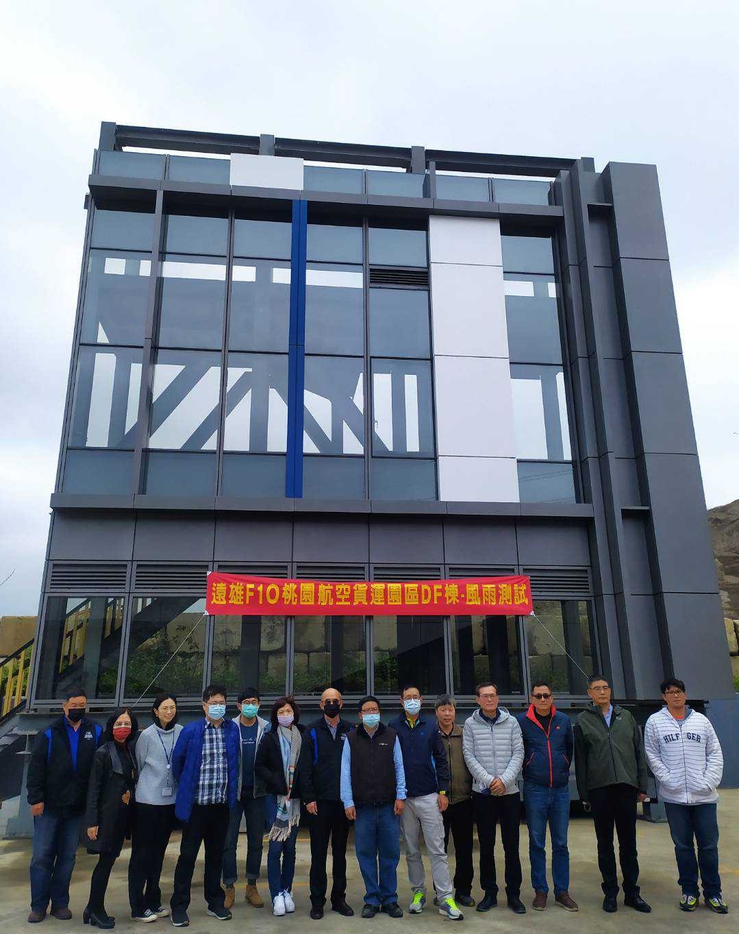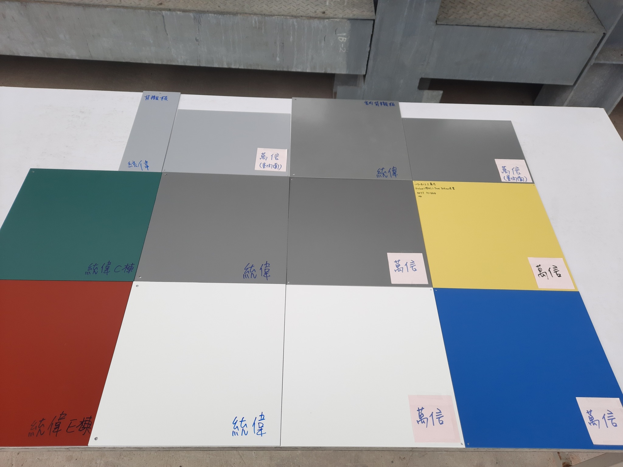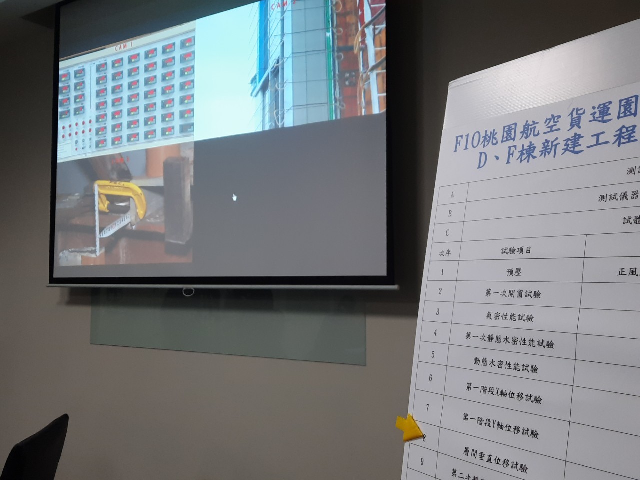 現場核對烤漆色板。 遠雄集團『F1O 桃園航空貨運園區 - 加值廠房D、F棟』新建工程,2020年12月24、25日於中國大陸東莞兆閔-風雨實驗室進行風雨測試,業主、顧問、設計單位於萬信鋁業會議室進行視訊會議確認試體測試狀況。